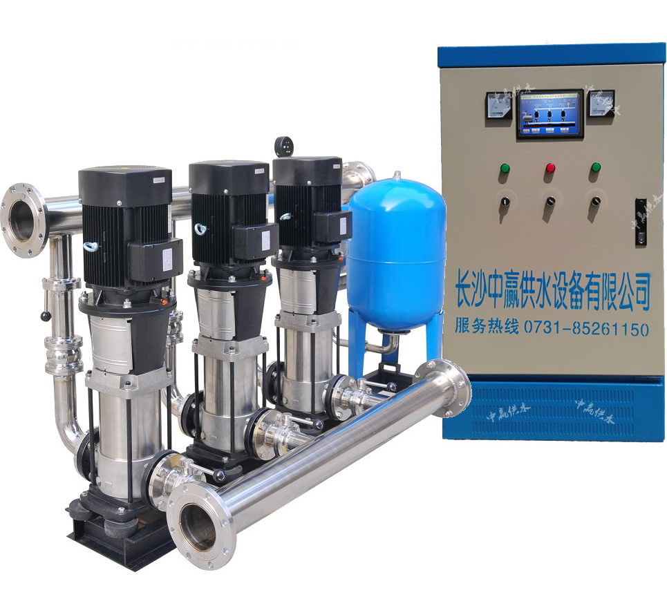 長沙中贏變頻恒壓供水設備主要由水泵機組、穩壓罐、壓力傳感器、變頻控制柜、無負壓罐、管閥附件等組成,變變頻恒壓供
